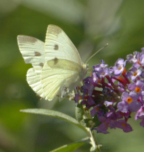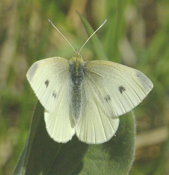 Description: mostly white, common butterfly, introduced from Europe, pest on cabbage and other cole plants