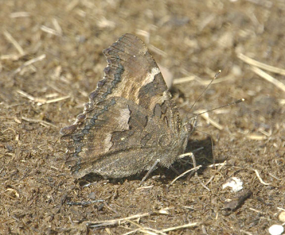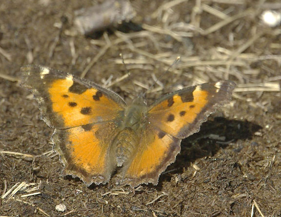 Description: orange with prominent black wing margins and markings above and camouflage gray beneath