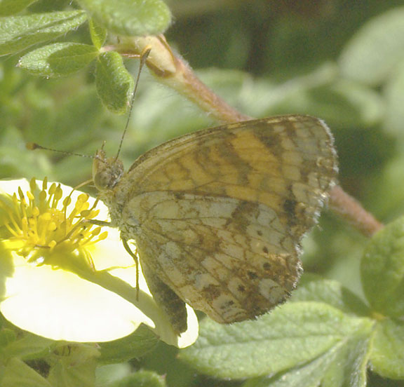 Description: small butterfly with checkered orange and black wings, frequents flowers in summer