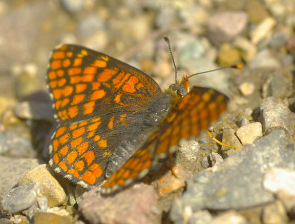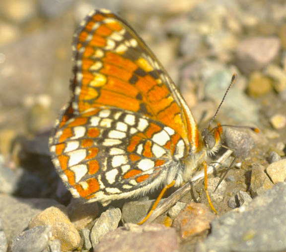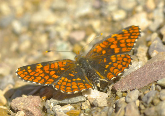 Description: small butterfly with checkered orange and black wings, frequents flowers in summer