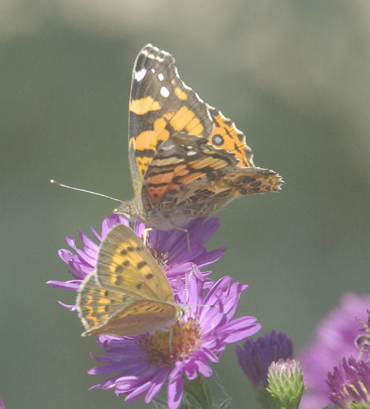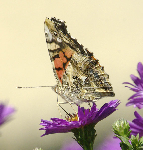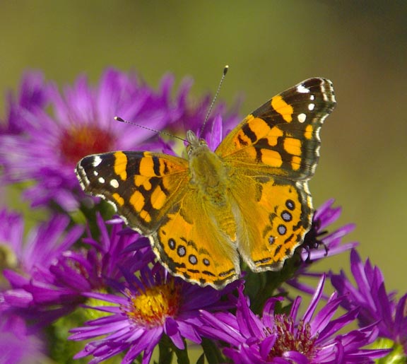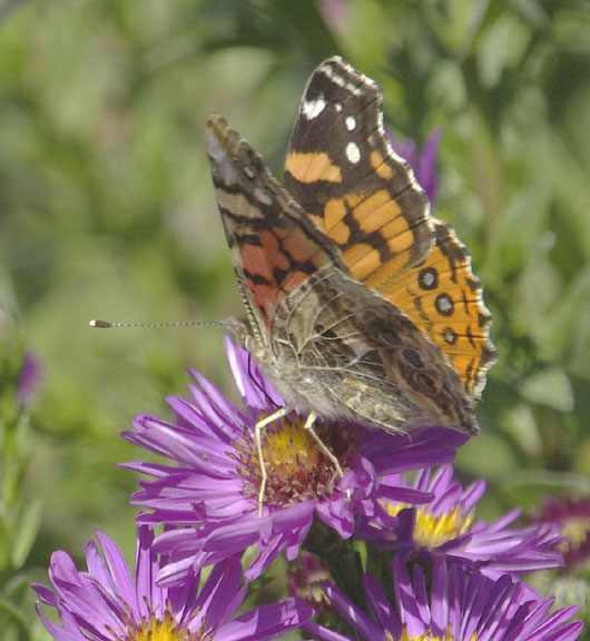 Description: probably the most common butterfly in the U.S., migrates north in huge numbers, basically pinkish orage above with black and white marks