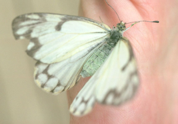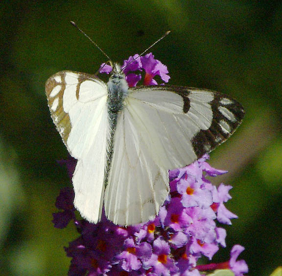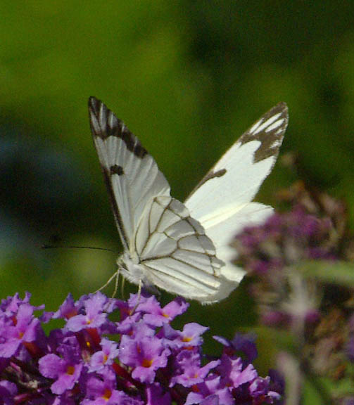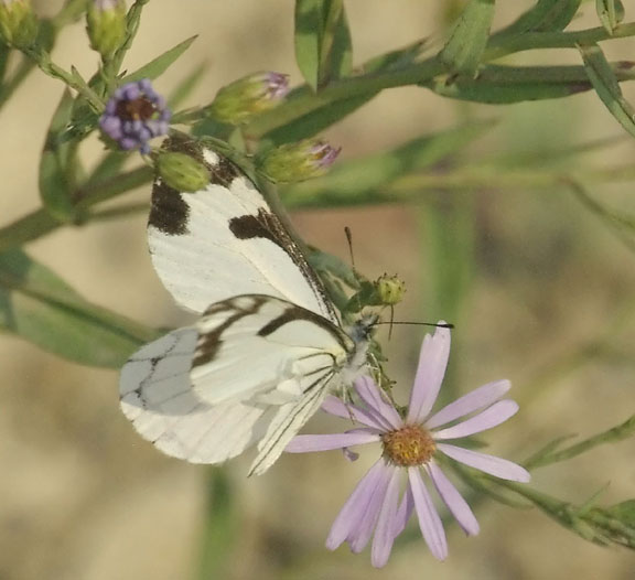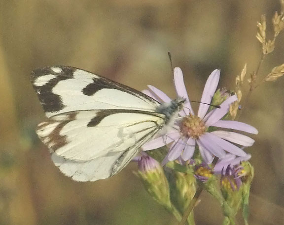 Description: common white butterfly with black markings, flies in and around pine trees, common on asters in late summer and fall