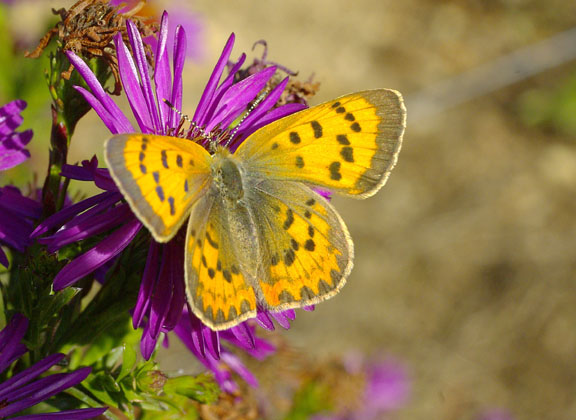 Description: purplish or orange with wavy orange line on margin of hindwings, increasing in abundance as summer progresses