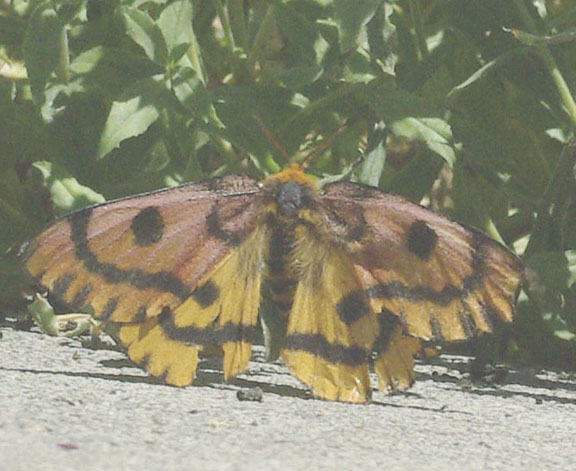Description: large, showy purplish and yellow moth with prominent black stripes and eyespots