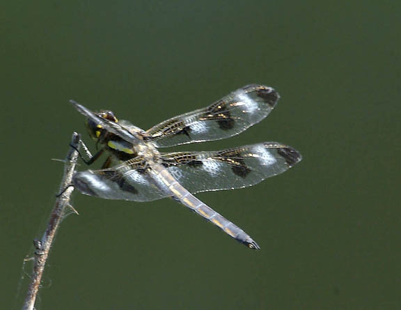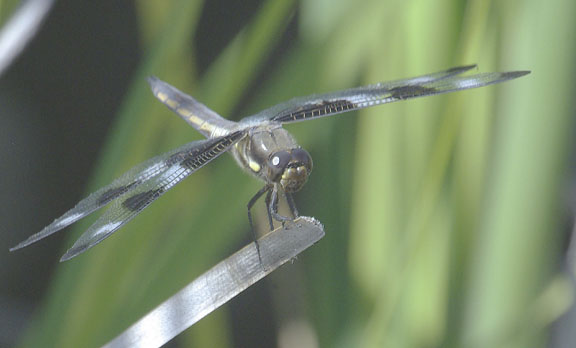 Description: brownish gray stocky abdomen with yellow stripes, prominent black and white spots on wings