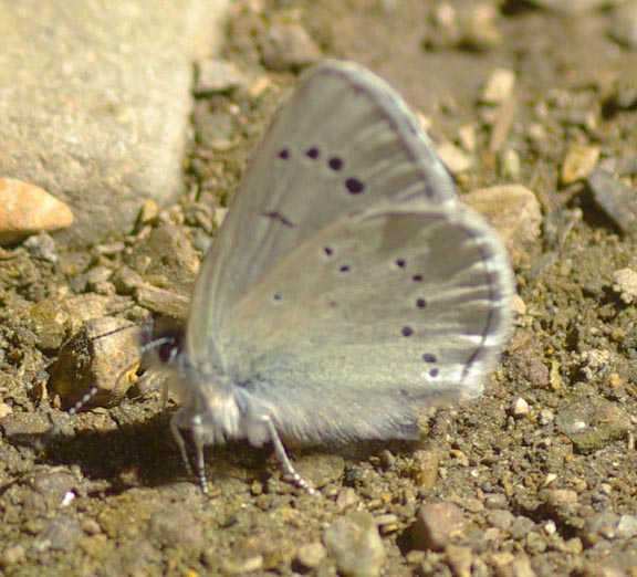 Description: small butterfly, blue on top and silvery underneath with black spots. Almost never sits with wings open.