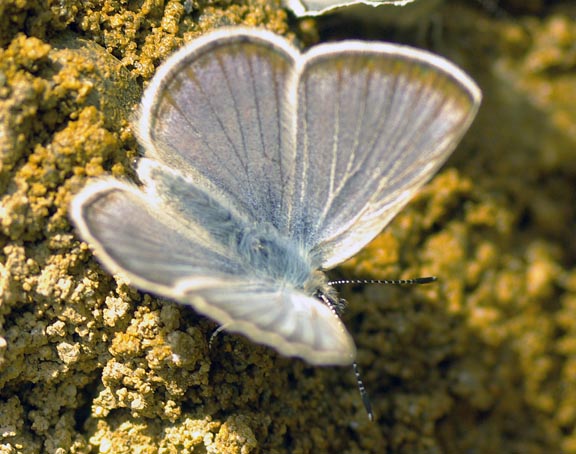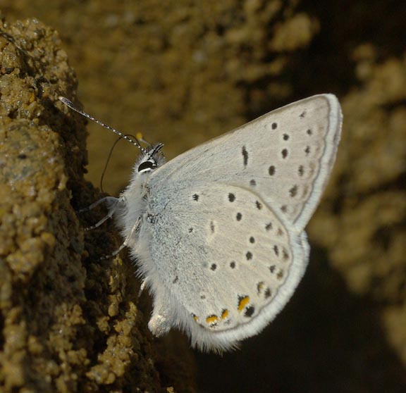 Description: small butterfly, blue on top and grayish underneath with black spots some bordered with orange. Often sits with wings open.