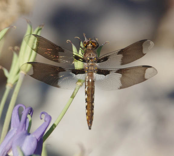 Description: medium sized dragonfly, abdomen white or brown with white markings, dark wing areas much larger on the male than female