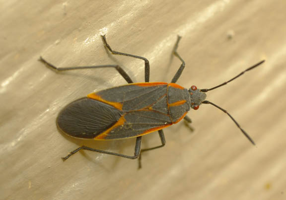 Description: medium sized mostly black bugs with red markings. Box elder bugs try to invade houses in large numbers in the fall