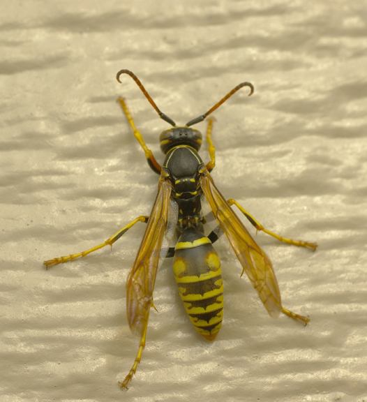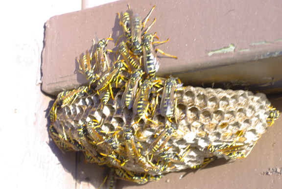 Description: black and yellow striped social wasps. Larvae are raised in umbrella nests built in protected locations such as building overhangs, birdhouses, under decks, etc. Introduced from Eurasia