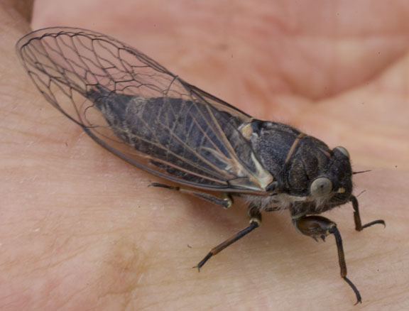 Description: large, big-headed, noisy insects with folded back wings, mostly dark gray to black
